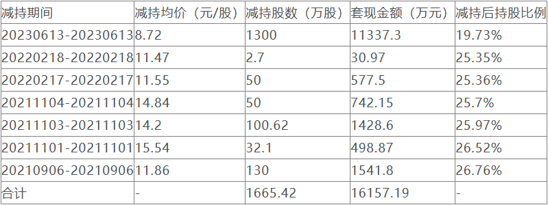 据新浪财经,周晓东最初持股3584.8万股,占总股本的28.30%。周晓东从2021年9月6日起,第一次减持晶华新材股份,迄今为止,累计减持公司股票1665.42万股,累计套现约1.62亿元。