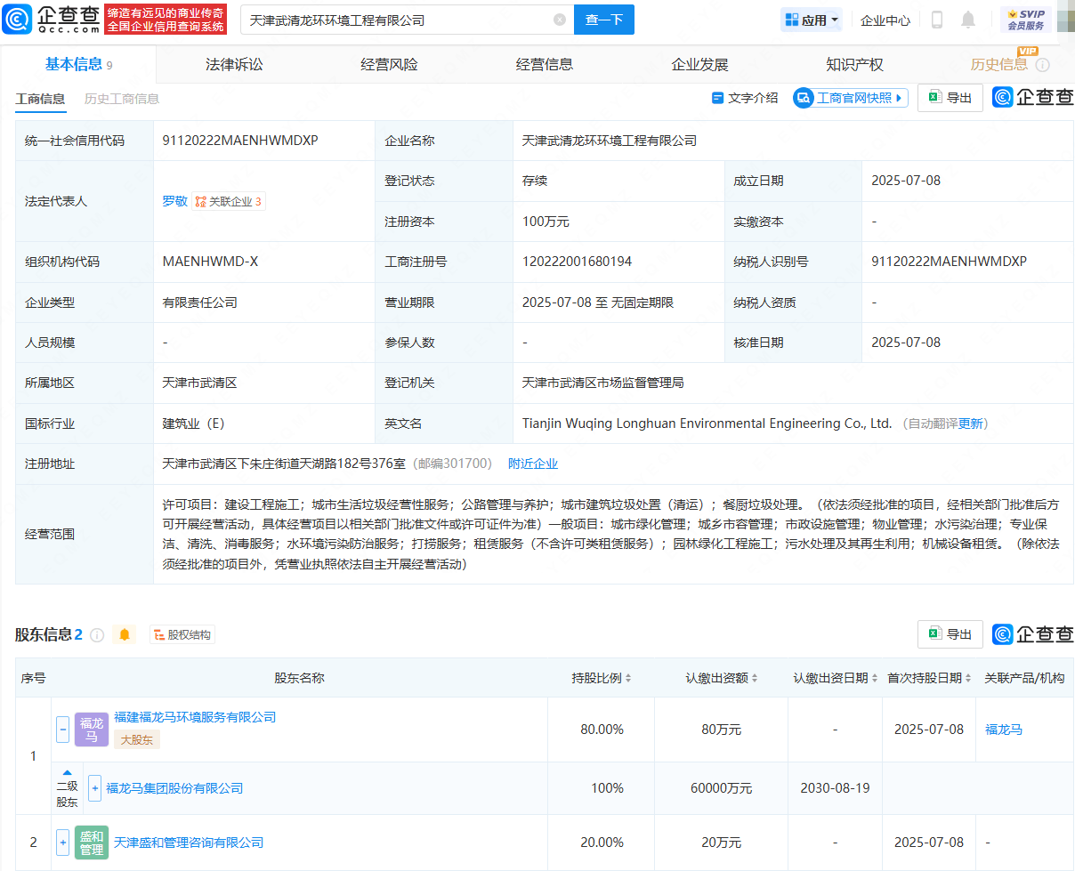 近日,天津武清龙环环境工程有限公司成立,法定代表人为罗敬,注册资本为100万元,经营范围包含:建设工程施工;城市生活垃圾经营性服务;公路管理与养护;城乡市容管理;市政设施管理等。股权穿透显示,该公司由福龙马(603686)旗下福建福龙马环境服务有限公司、天津盛和管理咨询有限公司共同持股。
