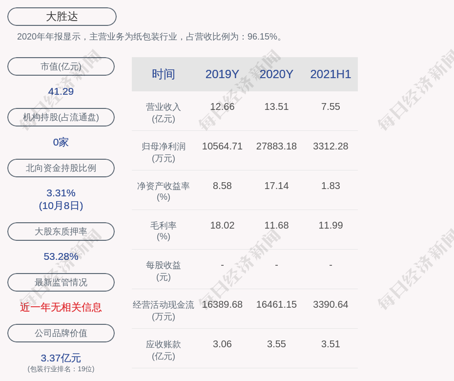 2020年年报显示,大胜达的主营业务为纸包装行业,占营收比例为:96.15%。