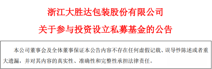 近日,浙江大胜达包装股份有限公司(下文简称:大胜达)发布公告,为了对暂时闲置的自有资金进行适度、适时的投资,获得一定的投资收益,进一步提升整体业绩水平,为公司和股东谋取更多的投资回报,公司拟发起设立私募基金。
