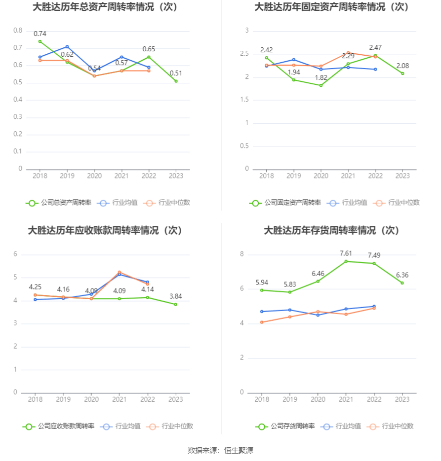 营运能力方面,2023年,公司公司总资产周转率为0.51次,上年同期为0.65次(2022年行业平均值为0.59次,公司位居同行业9/21);固定资产周转率为2.08次,上年同期为2.47次(2022年行业平均值为2.17次,公司位居同行业10/21);公司应收账款周转率、存货周转率分别为3.84次、6.36次。