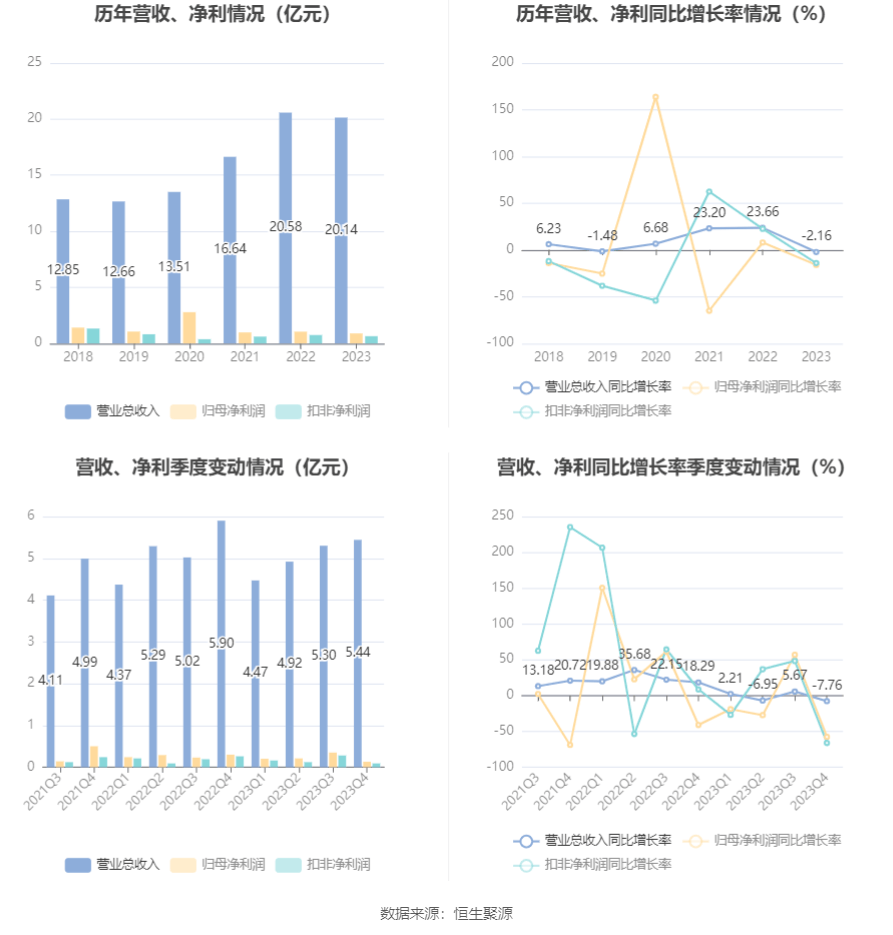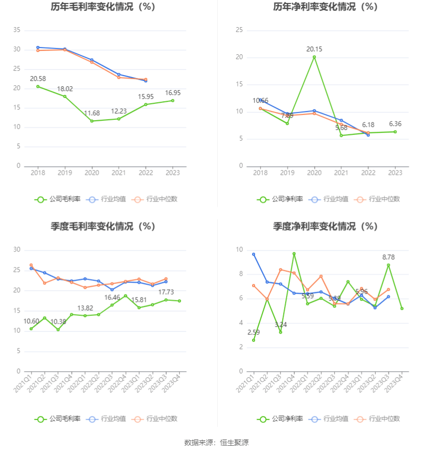2023年,公司毛利率为16.95%,同比上升1.00个百分点;净利率为6.36%,较上年同期上升0.18个百分点。从单季度指标来看,2023年第四季度公司毛利率为17.48%,同比下降1.28个百分点,环比下降0.25个百分点;净利率为5.20%,较上年同期下降2.21个百分点,较上一季度下降3.58个百分点。