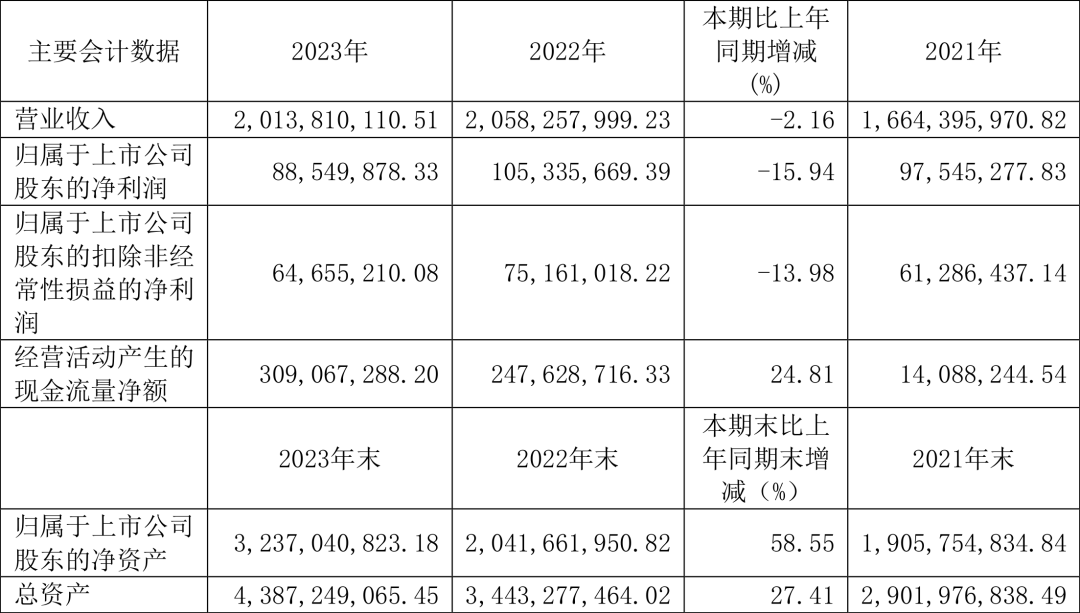 2023年,公司经营活动现金流净额为3.09亿元,同比增长24.81%;筹资活动现金流净额6.83亿元,同比增加6.95亿元;投资活动现金流净额-2.80亿元,上年同期为-3.62亿元。