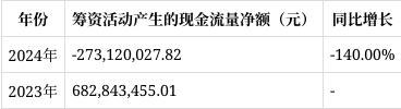 筹资活动产生的现金流量净额为-273,120,027.82元,去年为682,843,455.01元,主要因2023年向特定对象发行股票取得募集资金,而本年归还相关借款,导致筹资活动现金流量净额大幅下降。