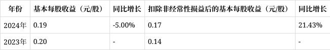 基本每股收益为0.19元/股,较上年的0.20元/股下降5.00%。扣除非经常性损益后的基本每股收益为0.17元/股,同比增长21.43%。这一变化反映出公司核心业务盈利能力增强,但整体收益受其他因素影响略有下降。