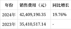 2024年销售费用为42,409,190.35元,较上年的35,410,517.14元增长19.76%,主要用于市场拓展和销售团队建设,以应对市场竞争,扩大市场份额。