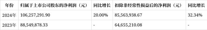 归属于上市公司股东的净利润为106,257,291.90元,较去年的88,549,878.33元增长20.00%。扣除非经常性损益后的净利润为85,563,938.67元,同比增长32.34%,主要得益于高端精品包装订单量增加,产品结构优化,盈利能力提升。