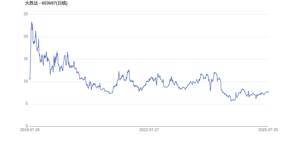 大胜达自2019年7月26日上市至今,已迎来6周年。从上市首日收盘价为10.58元、市值43.47亿元,到如今市值达到41.64亿元。