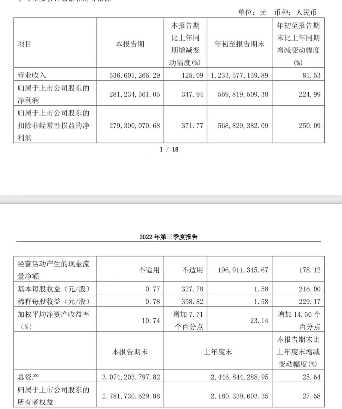 根据公告,今年前三季度,公司实现营业收入12.34亿元,同比增长81.53%;归属于上市公司股东的净利润5.7亿元,同比增长224.99%;经营活动产生的现金流量净额为1.97亿元。