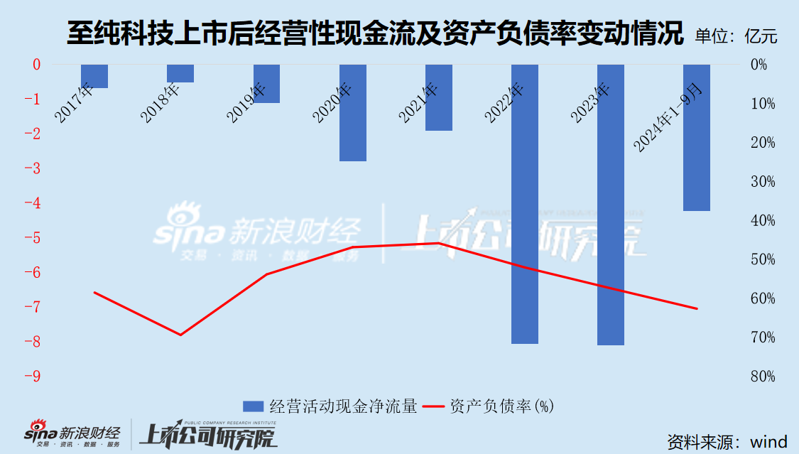 虽然至纯科技各期净利润均为正值,但几乎没有“造血”能力,一直处于“失血”状态。报告期内,经营活动产生的现金流量净额分别为-1.91亿元、-8.08亿元、-8.11亿元和-4.24亿元,合计流出22.34亿元;现金及现金等价物净增加额分别为-0.04亿元、-5.27亿元、-2.05亿元和-1.33亿元。