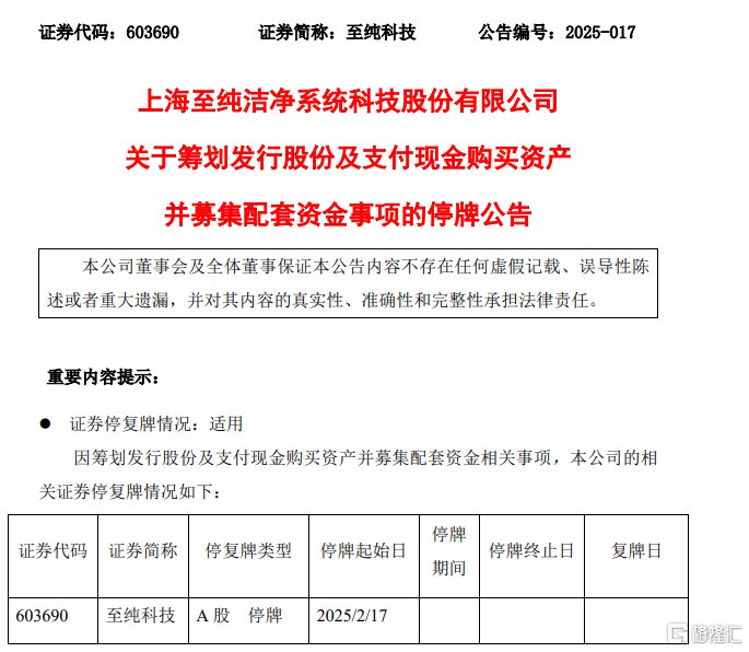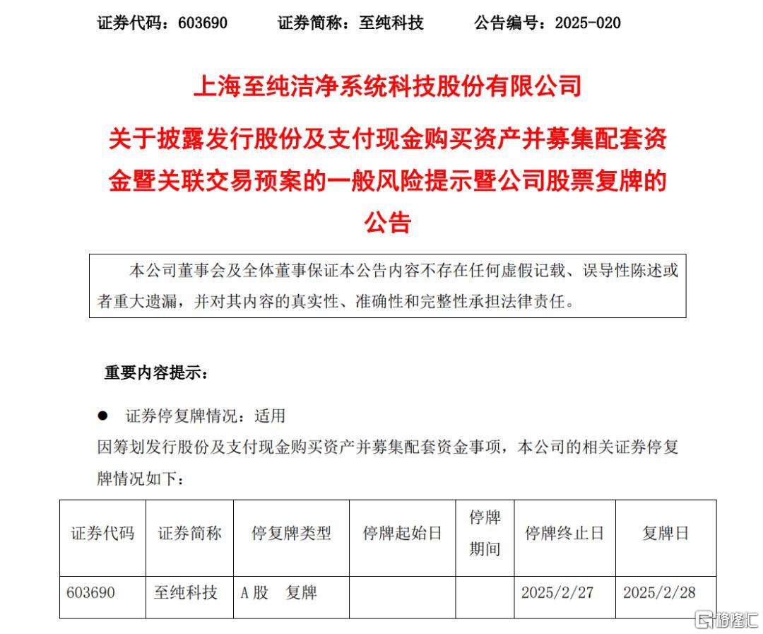 2月27日晚间,至纯科技披露发行股份及支付现金购买资产并募集配套资金暨关联交易预案,公司股票于2月28日开市起复牌。