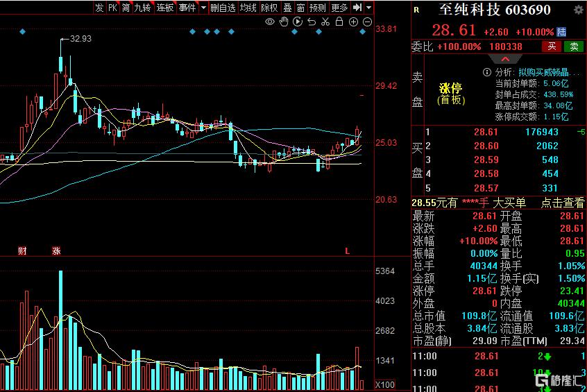 今日开盘,行情毫无意外,至纯科技开盘涨停,报28.61元,最高封单额超34.08亿元,成交额超1.15亿元,换手率1.05%。