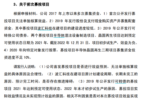 值得注意,在这份问询函中,交易所也注意到公司自IPO以来频繁的募集资金,但募投效果却不及预期。例如2019年的定增计划中,募投项目波汇科技在建项目的建设进度较低;2019年公开发行可转换公司债券,两个募投项目达到预定可使用状态日期为2021年,截至2022年末,项目初步试生产,效益为负;2020年的定增计划,募投项目半导体晶圆再生二期项目募集资金投资进度不足10%。