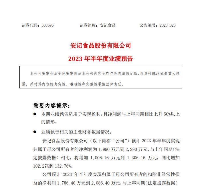 7月11日,安记食品(603696)发布2023年半年度业绩预告,即预计2023年半年度实现归属于母公司所有者的净利润为1990万元到2290万元,同比增加102.27%到132.76%;归属于母公司所有者的扣除非经常性损益的净利润1786.4万元到2086.40万元,同比增加48.36%到73.28%。
