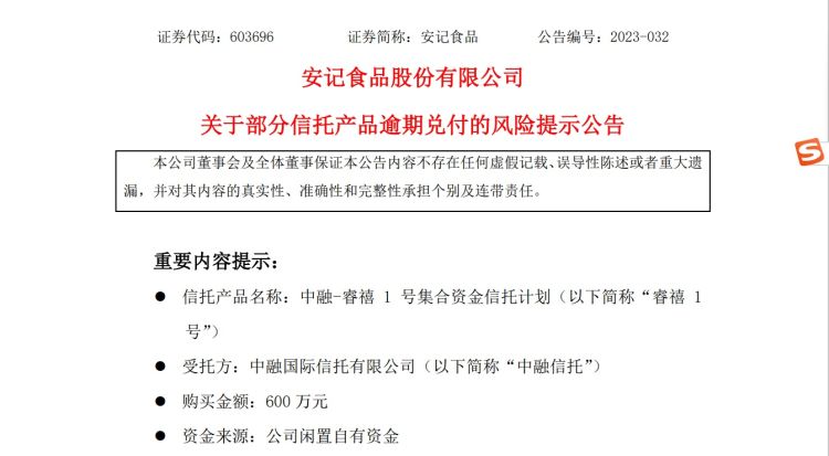 安记食品还在公告中做出了风险提示:鉴于上述信托产品投资款项的收回尚存在不确定性,并基于非保本理财产品的性质,存在本息不能全部兑付的风险,其对公司本期及期后利润的影响亦存在不确定性,具体情况以年度审计结果为准。