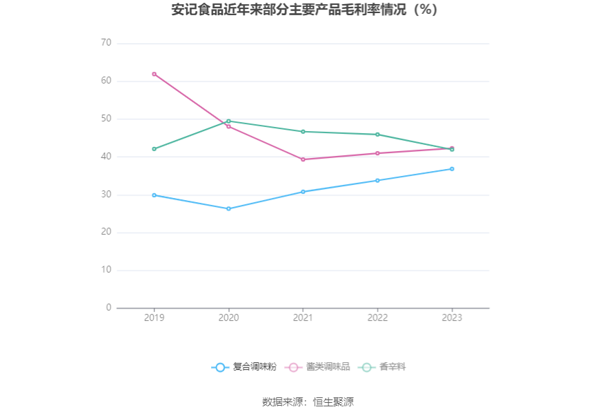 分产品看,复合调味粉、酱类调味品、香辛料2023年毛利率分别为36.84%、42.29%、41.96%。