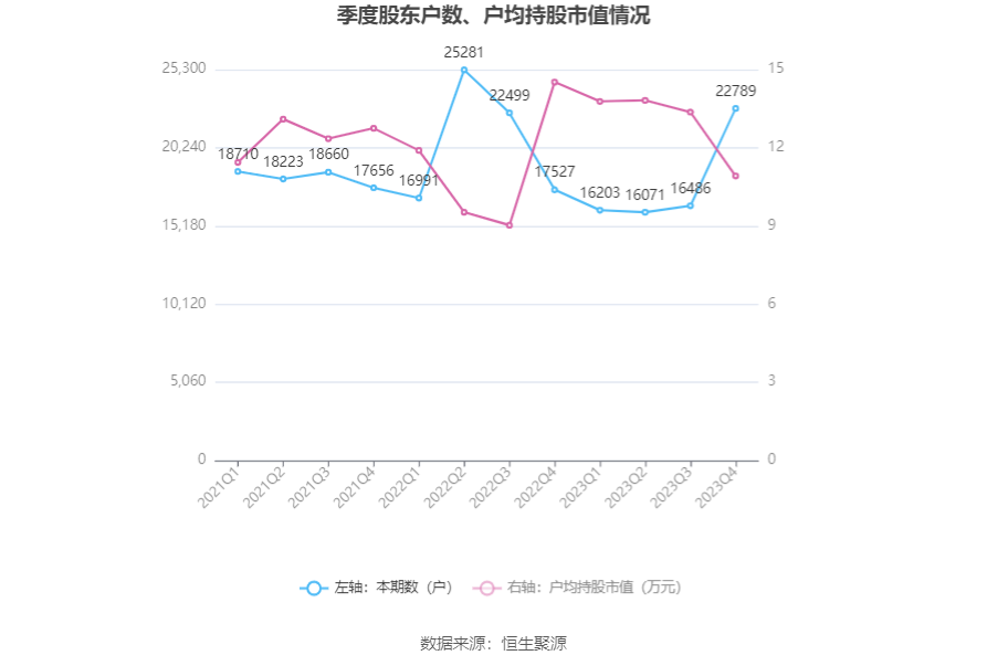 筹码集中度方面,截至2023年年末,公司股东总户数为2.28万户,较三季度末增长了6303户,增幅38.23%;户均持股市值由三季度末的13.37万元下降至10.92万元,降幅为18.32%。