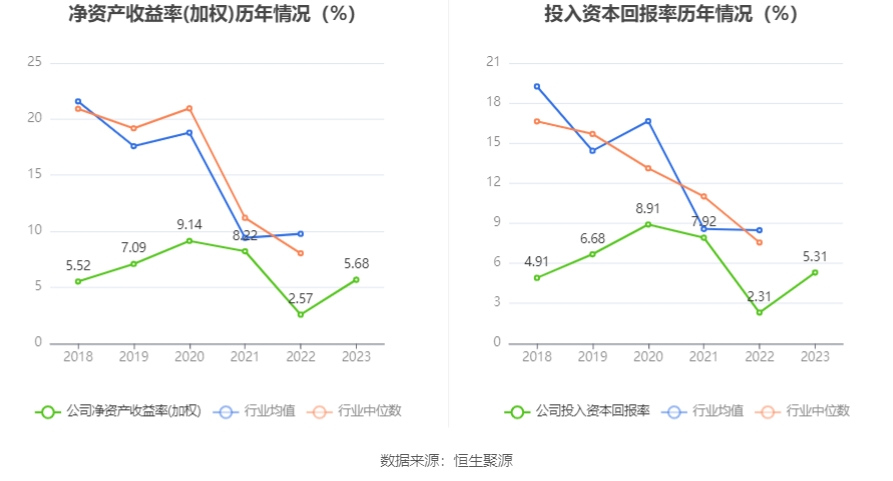 数据显示,2023年公司加权平均净资产收益率为5.68%,较上年同期增长3.11个百分点;公司2023年投入资本回报率为5.31%,较上年同期增长3.00个百分点。