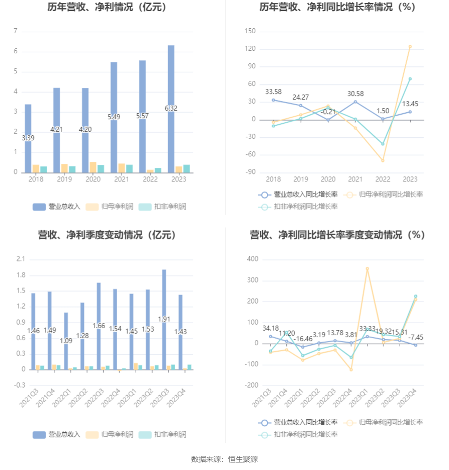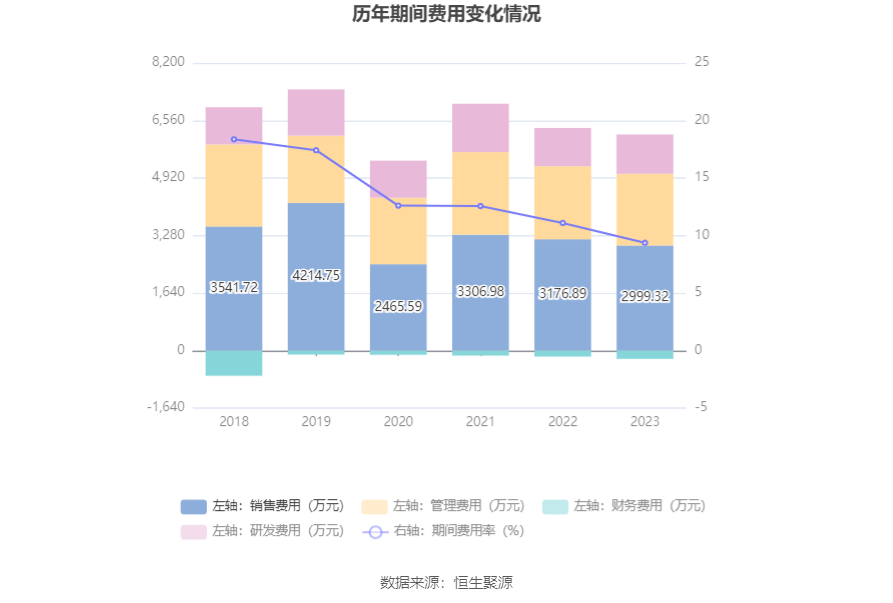 2023年,公司期间费用为5931.92万元,同比减少250.37万元;期间费用率为9.38%,同比下降1.72个百分点。其中,销售费用同比下降5.59%,管理费用同比下降1.85%,研发费用同比增长2.87%,财务费用-232.49万元,去年同期-166.77万元。