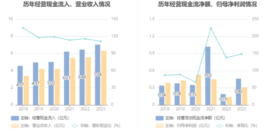 2023年,公司营业收入现金比为111.40%,净现比为148.45%。