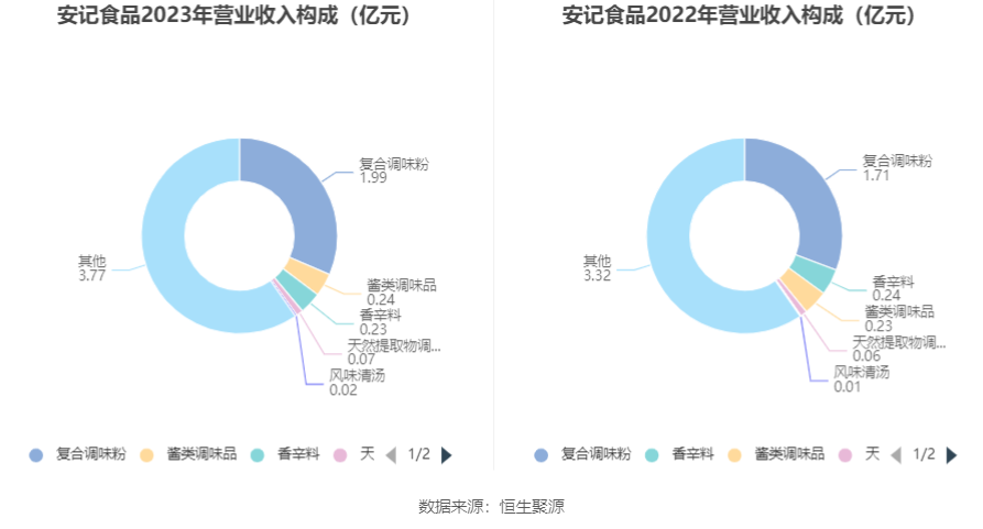 分产品来看,2023年公司主营业务中,复合调味粉收入1.99亿元,同比增长15.89%,占营业收入的31.41%;酱类调味品收入0.24亿元,同比增长4.47%,占营业收入的3.72%;香辛料收入0.23亿元,同比下降2.78%,占营业收入的3.62%。