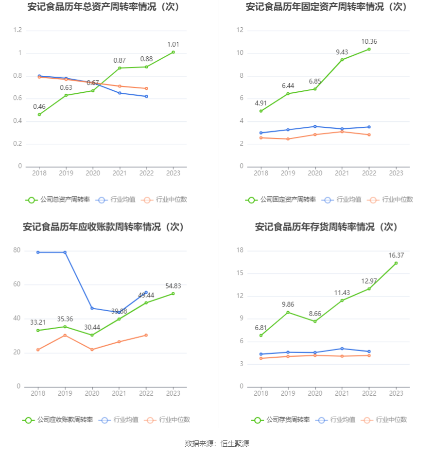 营运能力方面,2023年,公司公司总资产周转率为1.01次,上年同期为0.88次(2022年行业平均值为0.62次,公司位居同行业3/15);公司应收账款周转率、存货周转率分别为54.83次、16.37次。