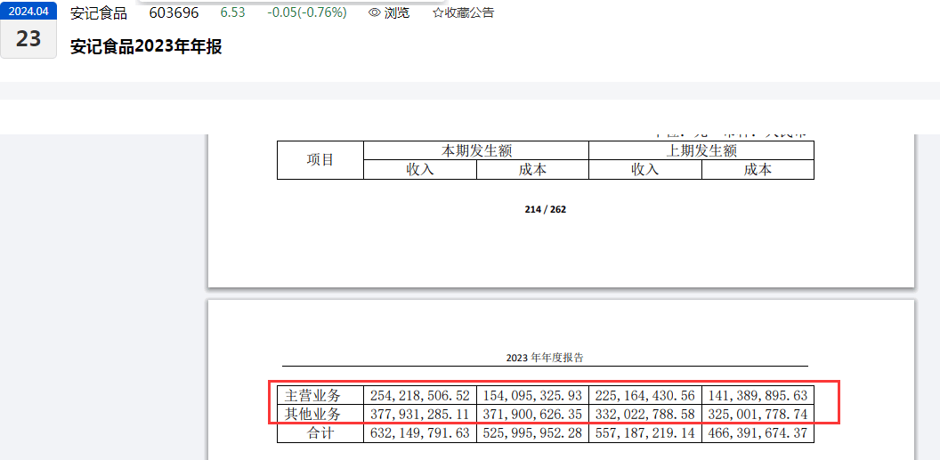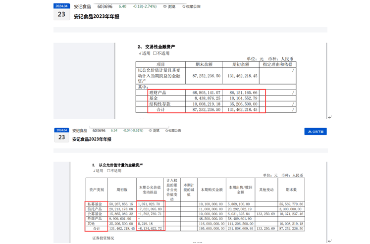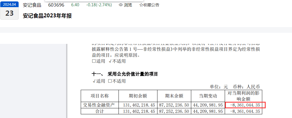 另外,从2023年度来看,安记食品录得“除同公司正常经营业务相关的有效套期保值业务外,非金融企业持有金融资产和金融负债产生的公允价值变动损益以及处置金融资产和金融负债产生的损益”的金额为:-7,399,083.12元(约739.91万元,上一年度为-908.98万元)。
