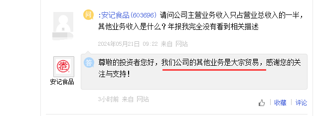 显而易见,在2022年度、2023年度,安记食品的主营收占总营收的比例仅有40%左右。同期,其他业务的占比已经超50%。笔者通过查询年报,并未发现其他业务具体指的什么业务。安记食品7月9日回复投资者表示,公司的其他业务是大宗贸易。