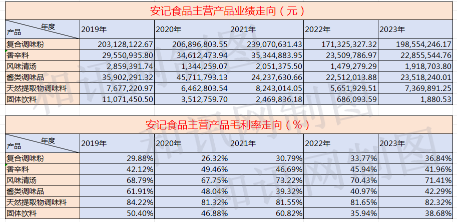 从主营业务的具体产品来看,安记食品在2019年度-2023年度的报告中所罗列的全线产品即复合调味粉、香辛料、风味清汤、酱类调味品、天然提取物调味料、固体饮料,其营收在这五年的走势呈现整体下滑。