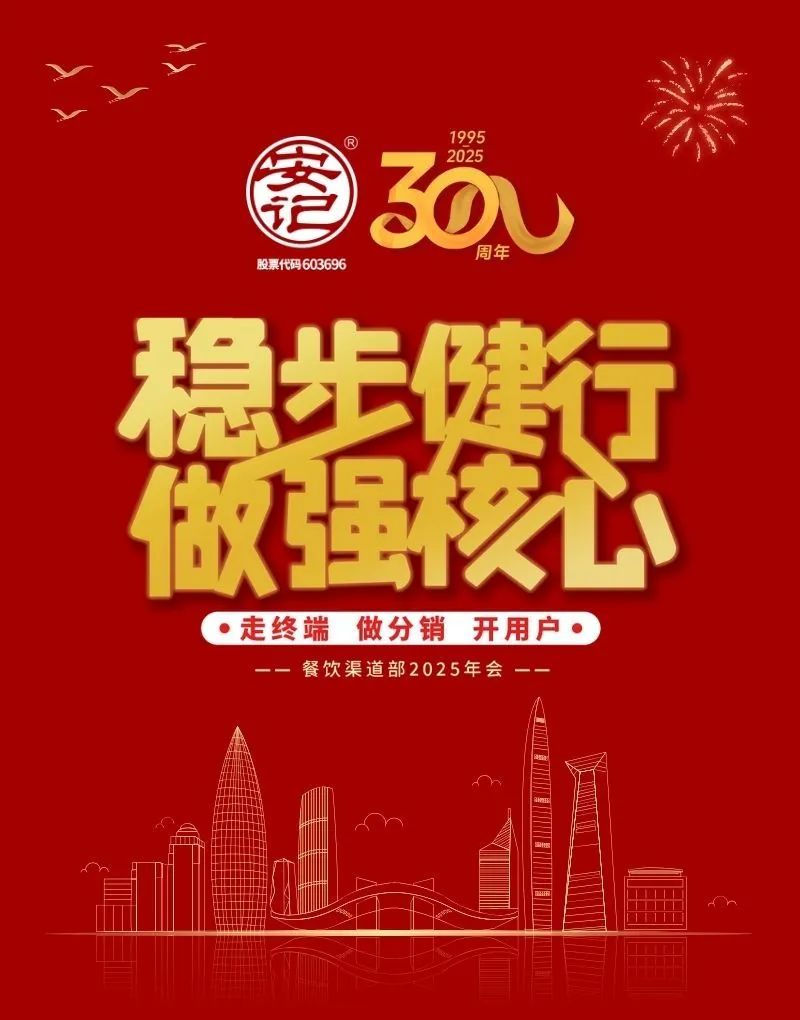 2025年2月26日,安记食品餐饮渠道部于广东广州召开了以“稳步健行,做强核心”为主题的年会,此次会议汇聚了来自餐饮渠道部及总部的众多人员,共同为安记食品在餐饮市场的进一步拓展蓄势待发。此次会议旨在总结2024年市场成果,部署2025年餐饮渠道拓展计划,并进一步整合总部资源支持区域发展。为公司的长远发展奠定坚实基础。
