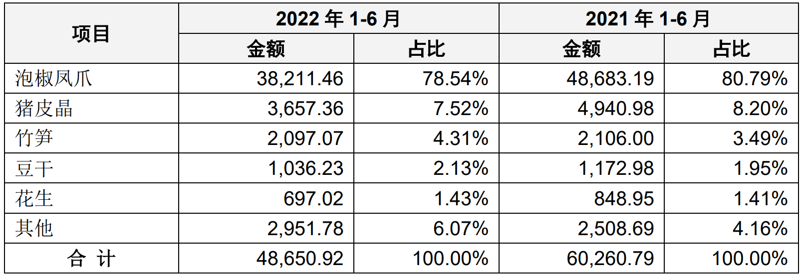 为何上半年公司业绩大幅下降?作为公司的主打产品,泡椒凤爪今年上半年销售不佳。根据有友食品2022年半年度主要经营数据,今年上半年,公司泡椒凤爪收入约3.82亿元,相比上年同期的4.87亿元减少21.51%。