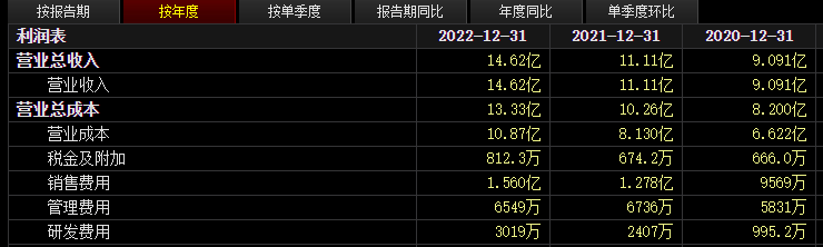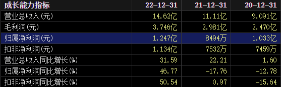 2022年,营收约14.62亿元,同比增长31.59%;归属于上市公司股东的净利约1.25亿元,同比增长46.77%。