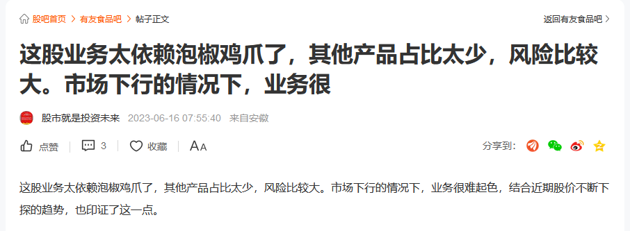 追其原因,股吧里有投资者指出,(有友食品)业务太依赖泡椒凤爪了,其他产品占比太少,风险比较大。市场下行的情况下,业务很难起色。