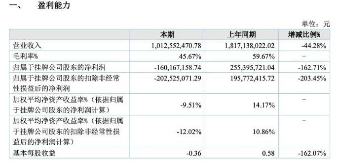 以最新年报为例,2022年营收10.13亿元,同比减少44.28%;归母净利亏损1.6亿元,同比下滑162.71%。扣非后净利-2.03亿元,同比下滑超200%。毛利率从2021年同期的59.67%降到2022年的45.67%,净资产也有近25%缩水。