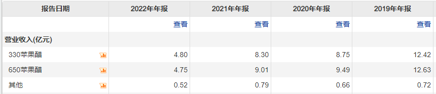 相比有友、劲仔,天地壹号大单品依赖更为突出。按产品类目,除了330苹果醋与650苹果醋两种产品,其余产品以“其他”代替。2019年至2022年后者收入仅0.72亿元、0.66亿元、0.79亿元、0.52亿元,均没超过亿元。以收入最高的2021年为例,330苹果醋与650苹果醋营收总计超17亿元,集中依赖性无需累言。