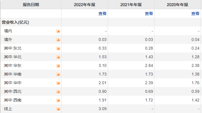 同时,劲仔食品产品销售主要集中在华东、华中地区。2022年营收分别为3.10亿元、2.01亿元,东北、西北地区市场则较为薄弱。且华东市场已连续两年同比下滑、华中地区同比上年也出现下降,是否有成长瓶颈值得观察。
