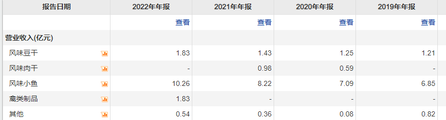 乍看产品线丰富,实际上主力仍是鱼制品为主。以2022年为例,风味小鱼营收10.26亿元,占营收比超七成。风味豆干营收1.83亿元,禽类制品1.83亿元,其他0.54亿元。