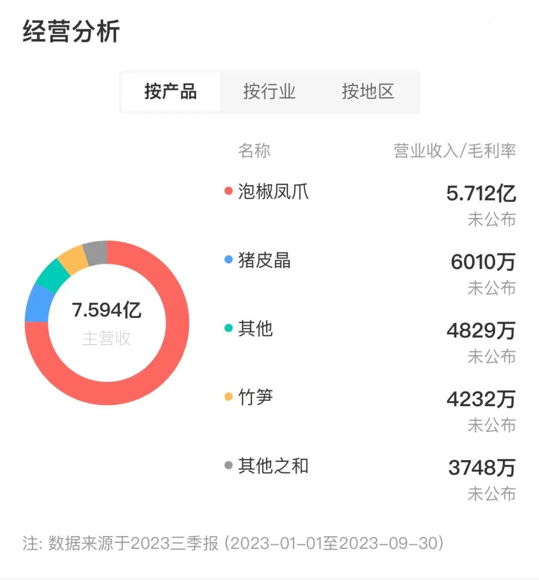 但是近年来,公司泡椒凤爪的经营业绩和毛利率水平均持续下降。2022年全年,公司泡椒凤爪产品销量下滑28.48%,对应收入7.83亿元,同比下降18.57%,占主营业务收入的76.68%。公司整体营收下降16%。