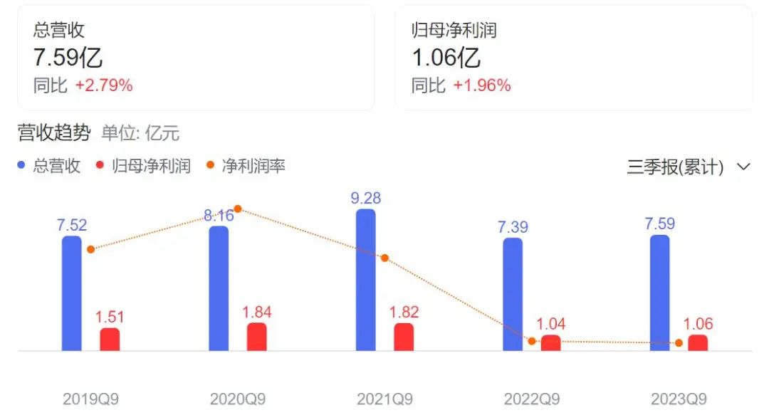 根据公司披露2023三季报显示,有友食品营业收入实现7.59亿元、归母净利润1.06亿元,同比分别增长2.79%和1.96%,扣非净利润8931万元,同比下降-5.73%。