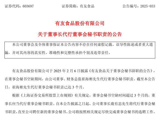 近日,“泡椒凤爪领军者”有友食品发布公告,宣布其董事长鹿有忠将临时接掌董事会秘书的职责。
