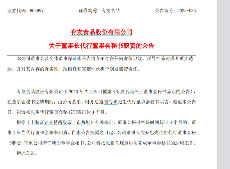 三个月时间很快过去,有友食品新董秘仍然没有到位。2025年5月6日晚间公司宣布,根据有关规定,董秘空缺时间超过3个月的,董事长应当代行董秘职责。自公告披露之日起,公司董事长鹿有忠将代行董秘职责。
