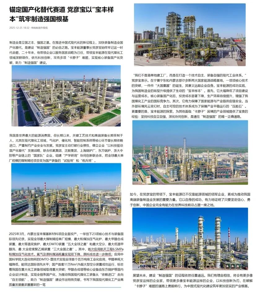 近日,《锚定国产化替代赛道党彦宝以“宝丰样本”筑牢制造强国根基》一文发布。文中,航天工程公司客户宝丰能源特别提到“6.5MPa粉煤加压气化技术”:实测显示,氧气与原料煤消耗同步下降,原料成本进一步降低,为装置高效、低碳运行提供了“航天级”方案。