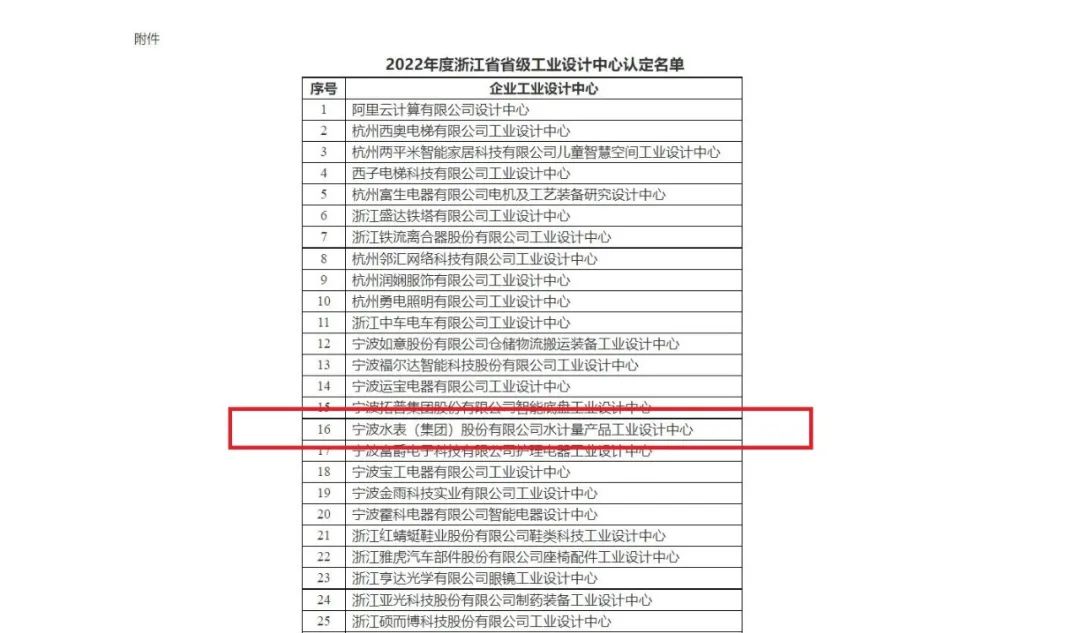近日,浙江省经济和信息化厅公布了2022年省级工业设计中心名单,宁水集团水计量产品工业设计中心成功入选。
