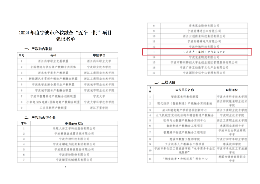 近日,宁波市发改委公布2024年度宁波市产教融合“五个一批”项目建议名单。宁波水表(集团)股份有限公司(以下简称“宁水集团”或“公司”)成功入选“五个一批”项目——产教融合型企业。