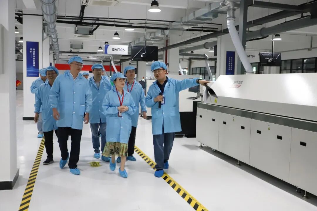 参观环节中,厂区负责人向各位领导及部门负责人进行了细致的讲解,并引领大家实地参观从SMT、烧录、测试、焊接、通讯检测、模块组装、自动灌胶、耐压、性能检测到检定包装的全自动化生产流程。
