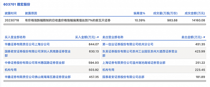 7月18日,德宏股份今日涨停,龙虎榜数据显示,上榜营业部席位全天成交4562.31万元,占当日总成交金额比例为32.22%。其中,买入金额为3030.4万元,卖出金额为1531.91万元,合计净买入1498.5万元。