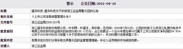 据浙江证监局[2021]21号显示,2020年7月31日,盛洋科技的控股子公司浙江虬晟光电技术有限公司收到与收益相关的政府补助135.11万元,占公司最近一个会计年度经审计归属于上市公司股东净利润的34.91%,公司于2020年8月8日才披露《关于获得政府补助的公告》,未及时履行信息披露义务。