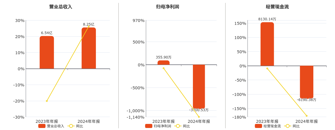 公司营业总收入为8.25亿元。归母净利润为-3700.53万元,较去年同报告期归母净利润减少4056.43万元,同比较去年同期下降1139.76%。经营活动现金净流入为-6190.38万元,较去年同报告期经营活动现金净流入减少1.43亿元,同比较去年同期下降176.14%。