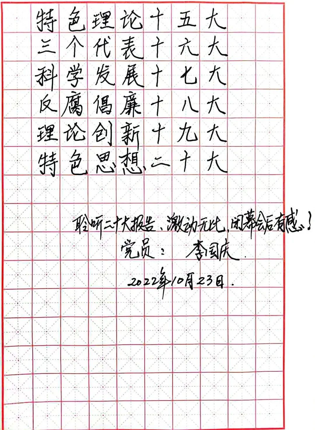 “总书记的报告中‘江山就是人民,人民就是江山。中国共产党领导人民打江山、守江山,守的是人民的心’,我不禁感慨,何其有幸,生于华夏,何其有幸,能够见证这一历史时刻。回望过往的奋斗路,眺望前方的奋进路,我们要牢记习近平总书记的嘱托,坚定不移听党话、跟党走,永葆攻坚克难的信心勇气,为全面建设社会主义现代化国家贡献自己的一份力量。”