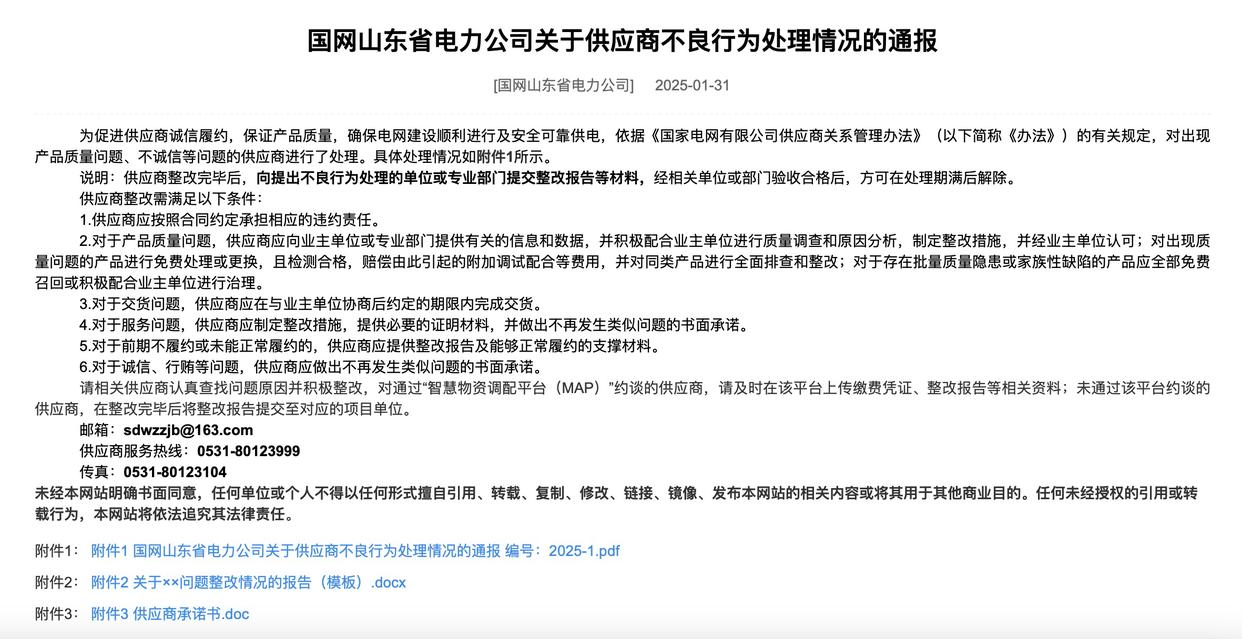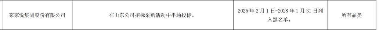 近日,国网山东省电力公司发布关于供应商不良行为处理情况的通报,显示家家悦集团股份有限公司(以下简称“家家悦”,股票代码:603708)因为存在招标采购活动中串通投标的不良行为,被国网山东省电力公司列入黑名单,列入黑名单的时间是2025年2月1日至2028年1月31日,范围是所有品类。